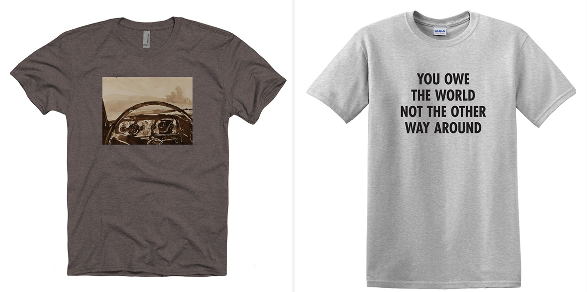 Some of Holzer’s works are in the Minneapolis Institute of Arts’ collection—and the fine art museum has asked Holzer and four other contemporary artists (Kota Ezawa, Chris Larson, David Rathman, Alec Soth) to help celebrate its 100th anniversary by designing a special collection of T-shirts, dubbed “Artist Statements.” Each T-shirt, from Soth’s cutout of a jumping cheerleader (taken from his 2012 work “Bree, Liberty Cheer All-Stars, Corsicana, Texas”) to Ezawa’s cartoon-like snapshots, is distinctive of each artist’s unique work and style—and completely wearable. But it’s Holzer’s T-shirts, bearing thought-provoking phrases like, “When something terrible happens people wake up” and “All things are delicately interconnected,” that especially stand out and require an attitude to match it.