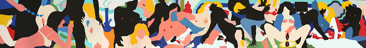 Xavier Schipani, an artist who currently calls Austin, Texas home, will be returning to his native East Coast for a solo exhibition at Superchief Gallery‘s Brooklyn location. Though Schipani’s older work can mostly be found in black and white, his experimentation with color over the past year has been rewarding to observe. It’s culminated in five works for “What is I to You?” that are as bold in color as they are in subject. For example, the piece “Me, You and Them” (pictured below) is 15 feet long and illustrates a group orgy—from anal beads to self love—in an inviting, hypnotizing way that might not be possible, say, through photographs. Instead, Schipani’s work invites the viewer to stay with no shame.