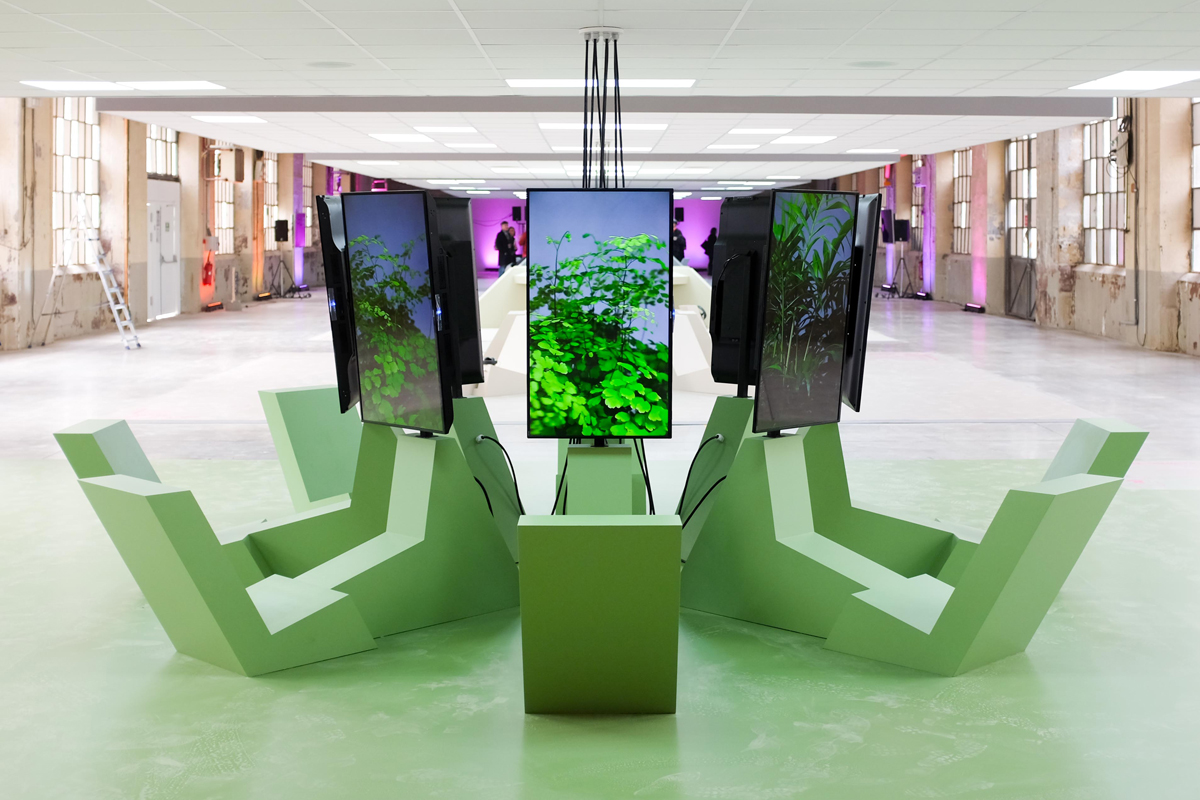 Another common theme at the event is that of work—more specifically work in the context of technology. Thanks to relentless notifications for e-mails, messages and calls, even without a traditional office, work follows us all the time. The exhibition “Working Dead” presents this idea as a spectacular installation. Five environments are aligned in a 1000-square-meter industrial space. Fake floors and ceilings recall a fairly dull office space, but no objects are on display—there are only sounds, voices, and images that create immersive and evocative situations of work. According to curator Didier Fiúza Faustino the five installations “look like temples or mausoleums, maybe graveyards” for quite a maudlin message.