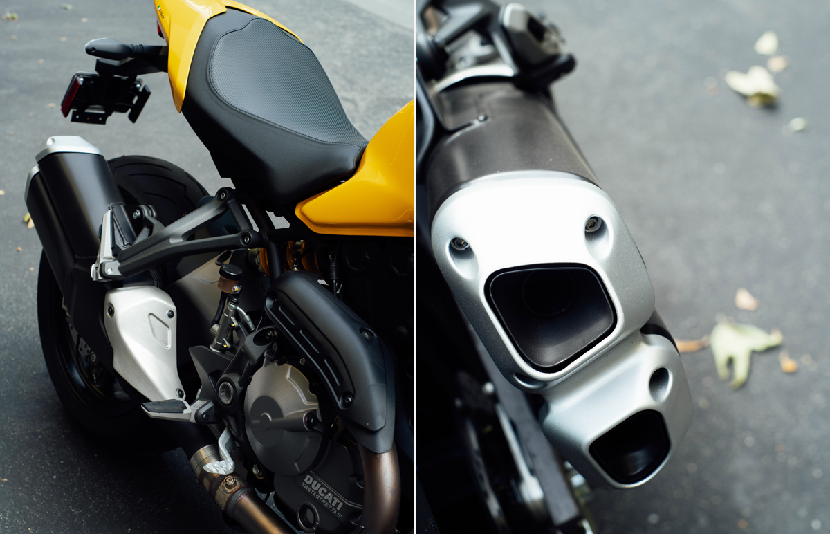 Antonacci’s words certainly translate when looking at the new Monster 821. It does indeed wear its version of the tightly sculpted tank very well. It’s also one of the more comfortable tanks to grip with your knees when tossing the bike back and forth on a winding road. There is nothing more enjoyable than good design that translates to a positive experience, especially with something a person connects to as directly as a motorcycle. The aforementioned all-new asymmetrical exhaust draws a rider in further with its raspy yell during moments of liberal throttle application, as well as a decent amount of pops and burbles when coasting off throttle.