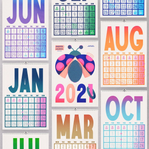 Risotto Studio’s limited edition risograph 2021 calendar (£18) features 12 colorful illustrations designed and produced by the studio staff in Glasgow. Made with the intention to hang, the A3 calendar features a white wire binding to keep the recycled paper calendar intact, and a considerable amount of space on each page for notes and reminders. Plus, it features lunar phases and a zodiac key. Price is in Pounds.
