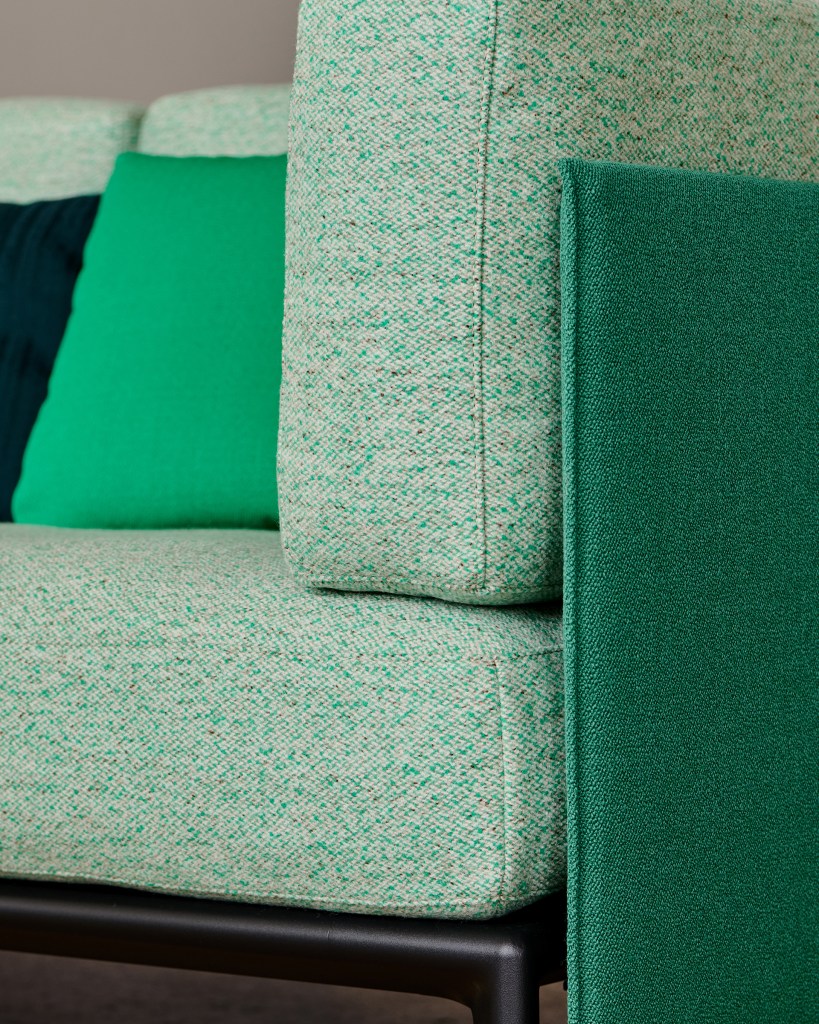 Panter&Tourron wove in some Vitra furniture signatures (like the shape of the dye-cast legs) but said no to others (like chrome and leather). “Instead, we had to find beautiful materials and colors that conveyed a sense of luxury and desirability,” Tourron says. “All of the fabrics are either natural, cotton or wool, or from recycled materials. The biggest challenge we gave to Vitra, however, was that we did not want any polyurethane. The main cushion is stuffed with recycled PET fibers. This was handled on their side. They did their homework and found better options for filling.” Currently, there is still a slender polyurethane strip in the cushion because there was no other material available in the studio to guarantee the highest level of comfort—but Tourron says they already have a solution to replace it which will roll out in a year or two. It will be very easy to replace in the existing product.