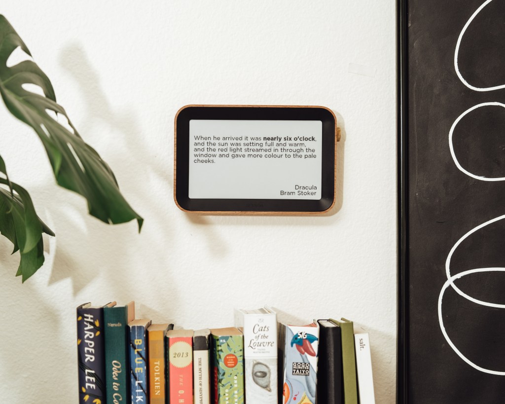 Part literary archive and part talking prompt, the Author Clock functions as a statement piece for the home or office. It’s built using white oak wood from sustainable forests, capturing the easy elegance of the unit’s mid-century design. The wood framing, juxtaposed with the black front bezel (crafted from recycled plastic) highlights the paper-like screen, making the timepiece adaptable to a variety of decor.