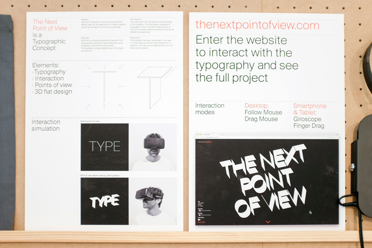Graphic design is well-represented throughout the show, but “The Next Point of View” is particularly innovative. Prctica and David Galar were asked to reinvent Gravient’s brand identity, including a custom typeface. Since the client creates VR and AR experiences, the designers were inspired by 3D and the behaviors associated with virtual reality. The result is typography that changes according to its rotation in space, not according to the classic styles. For example, instead of having bold, capital or italics, the styles we find are vertical, horizontal and diagonal.