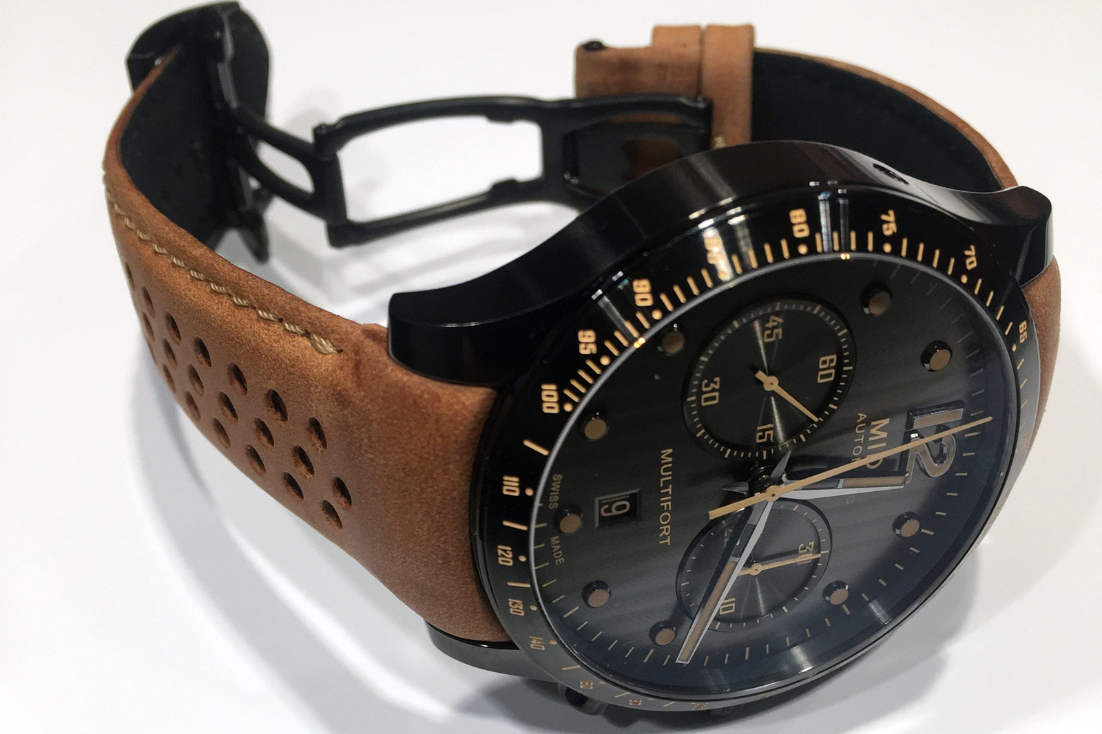 A new addition to the Mido Multifort line, this year’s Chronograph Adventure—with a self-winding Caliber 60 automatic movement—offers a black dial within a black bezel, enhanced by the tan-colored indicators and hour markers. It feels sportier than some of the previous Multifort offerings, especially on the perforated calfskin leather strap, but it definitely holds true to Mido’s traditional design inspirations: architecture. With a 100-meter water-resistance, it’s also begging to be used.