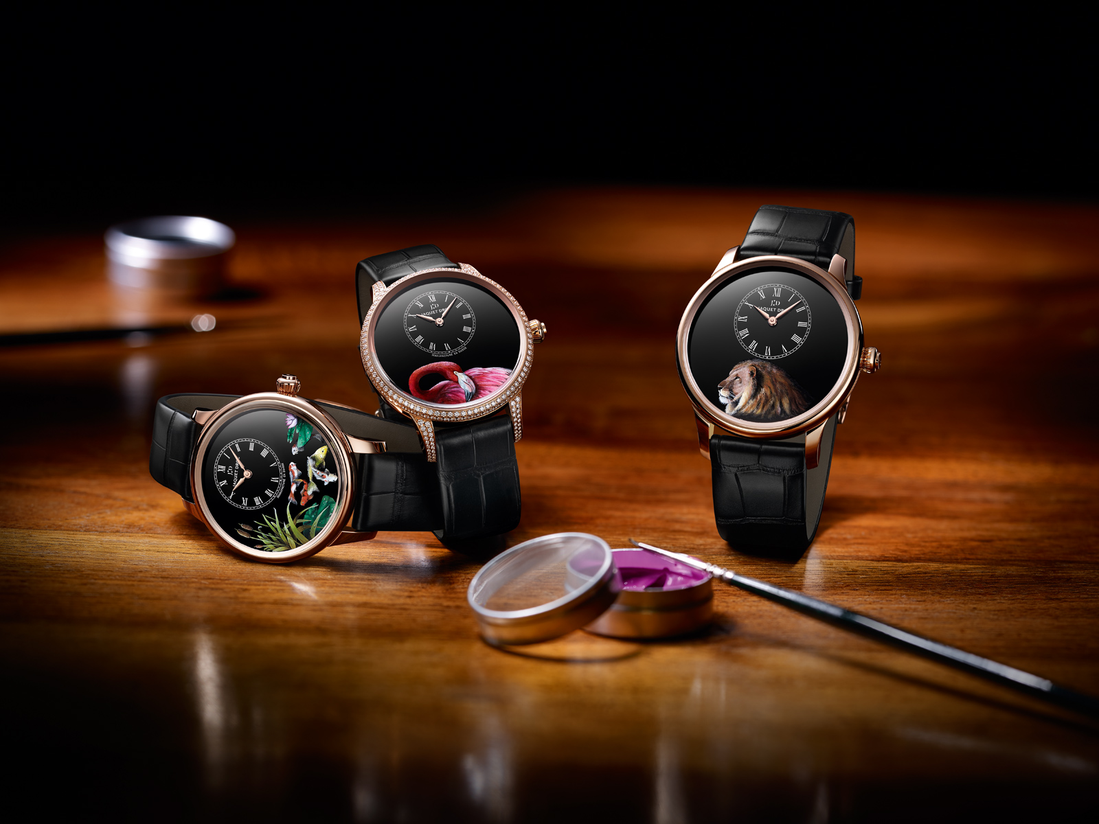 Being the smallest brand in the vastly successful Swatch Group has its perks. This positioning allows Jaquet Droz to produce pieces defined by wonder and artistry. The expansion of their Petite Heure Minute collection embodies this. Here, tiny paintings (made by hand) of a lion, flamingo and koi carp stand out against black Grand Feu enamel. This is a case study in magnificence, and the brand has not neglected the watches’ insides. Each of the 28 pieces in the three lines has a self-winding mechanical movement and features a 68-hour power reserve. Due to the labor behind each piece, prices range from $30,000-40,000.