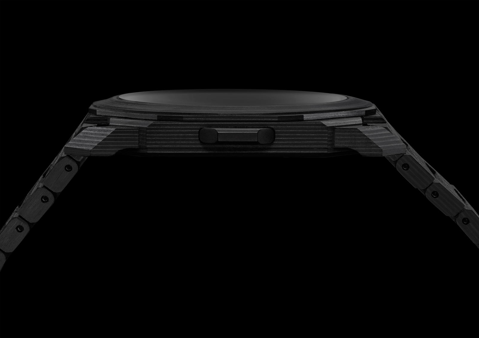The material also lends distinct patterning to the piece, so that it appears more than just murdered out. And the decision to carve out the indexes lends visual depth and grants slivers of a look at the movement (which is entirely visible through the sapphire glass portion of the caseback). The carbon bracelet concludes with a titanium folding-clasp that’s DLC-treated. It completes the aesthetic cohesion.