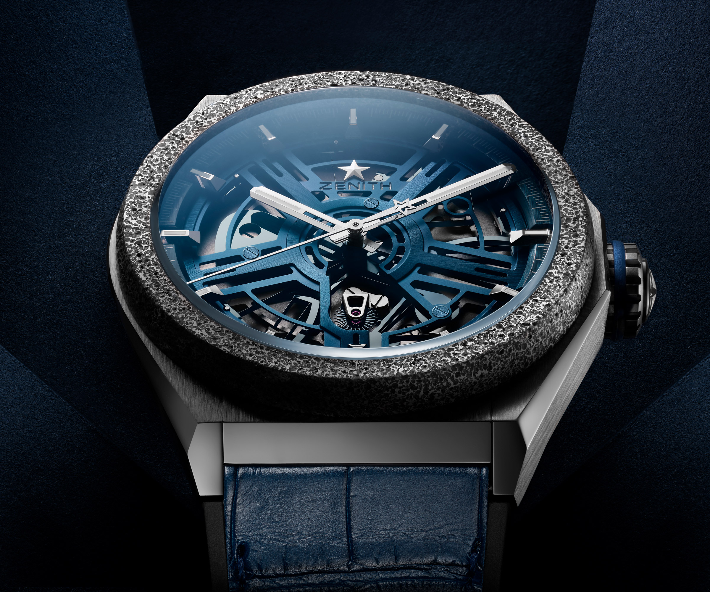 A masterwork of innovation inside and out, Zenith‘s limited run DEFY Inventor wristwatch features a high-frequency, patented “Zenith Oscillator” component that replaces traditional spring balances (an attribute of watchmaking used for three centuries). And then there’s the case, which is composed of lightweight titanium and Aeronith. That last material is purportedly the lightest aluminum composite in the world and composed of open-pore aluminum foam that’s been stiffened with a polymer. It appears where one would expect a traditional bezel—growing out of the lower portion of the case. Its strange texture presents a stark contrast to the architectural dial it encapsulates.