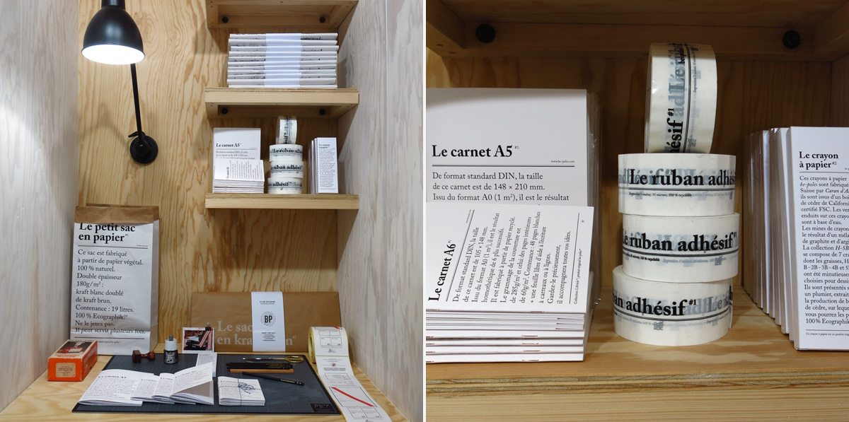 As well as the books, be-poles has created their own sturdy paper bags (“Le sac en papier”) for years, but this fall the studio has developed the one product into a whole, lust-worthy collection: L’Article. At Maison, be-poles showcased the new line, which pays “homage to simplicity” and is basically a much better take on everyday products like tote bags, tape, notebooks, soap and pencils—all with their names and details printed on the cover. The pencils are a collaboration with Caran d’Ache, and they’re a designer’s dream—each set features seven pencils: H, HB, B, 2B, 3B, 4B and 5B, all displayed in a wooden pencil box.