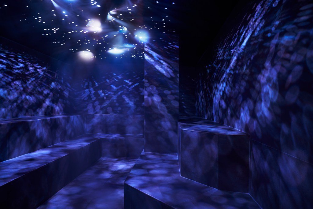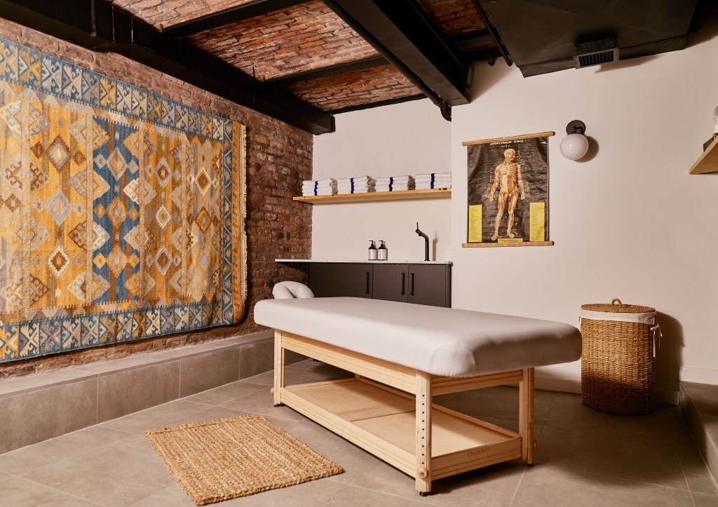 At the forefront of the space is a custom dark aqua and white Roman bathhouse-inspired mural created by Brooklyn-based artist and illustrator Amit Greenberg. Various cedar wood saunas and a steam room with custom lighting inspired by the night sky activate the space, creating an ambiance that is social and also meditative. Also included are 10 treatment rooms with original ceilings and many eclectic design touches such as kilim rugs, tribal masks, and vintage anatomical illustrations. Hidden away in a quiet corner of the women’s locker area, one can find a ritual room with a single cast iron bathtub at the base of an illuminated 100-foot-tall brick smokestack.