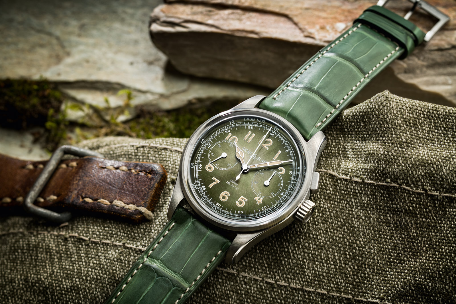 That’s one hell of a smoked green dial, perfectly complement by a green alligator leather strap. But there’s more than vintage-inspired aesthetic achievement in Montblanc‘s limited edition (100 pieces) 1858 Monopusher Chronograph. The 40mm stainless steel watch was developed to honor the Minerva monopusher chronograph calibre 13.20 movement, developed specifically for wristwatches back in 1920. As Montblanc own the Minerva manufacture, an updated iteration falls within this timepiece. The sapphire crystal caseback also offers a glimpse at the hand-finished components working inside.