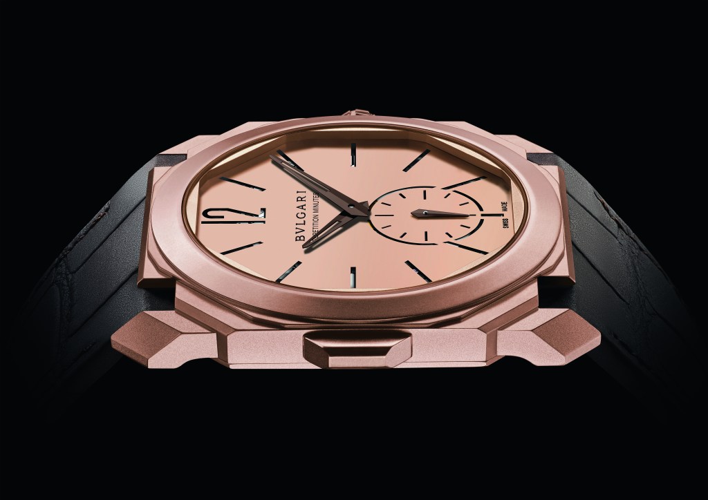 This is most clear with the Octo Finissimo Minute Repeater in sandblasted rose gold. A development from Bulgari’s 2016 minute repeater release, which set a record for the world’s thinnest timepiece with this challenging complication (a luscious chime, activated by way of a striking mechanism), the rose gold iteration is only 6.09mm thick. Its ultra-thin manual-wound BVL362 caliber movement—a reference to how many components come together for it, 362—also powers hours, minutes and small seconds. On a technical level, this must be seen to be believed (very few brands are capable of producing such a complication), but what individuals are left with is a fascination surrounding the way light interacts with the watch finish. This harmonious presentation of rose gold glows with life in a near profound way.