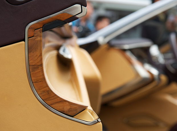 Based on the complexity of the car’s initial drawings the team realized that veneered wood was not going to be an option, so Christine Ebner, who heads up color and trim in the studio, set out to find a hardwood solution. In addition to the usual concerns about finding wood that complimented the car’s design, the designers realized that they needed to mill the components from sequential planks, and that they needed 11 two-inch planks—four of which had to be glued together to create the interior’s larger pieces. That’s a very big, old tree and issues of sustainability were a big concern in the studio.