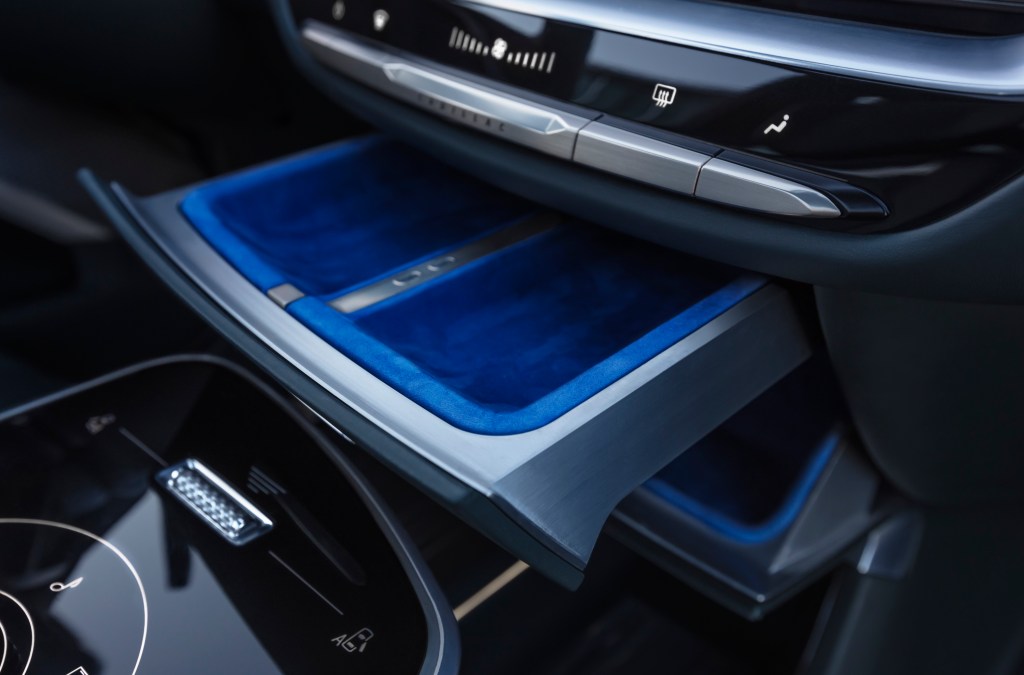 There are impressive details throughout, including in the center console that creates a great looking material made from layered scraps of leather used for the interior along with pieces of aluminum; vertically stacked, it presents a unique, chic upcycled touch. Sensory surprises in elements like the accessory drawer, which is fitted with a beautiful bright blue suede-like liner made with recycled material, and the textured crystal control knob. Jennifer Widrick, Creative Design Manager, noted that some of the design was more akin to jewelry making than to traditional car design, and that the intent was to create moments that revealed themselves on first, second and further looks. Texture and knurling are used throughout to create a sense of drama.