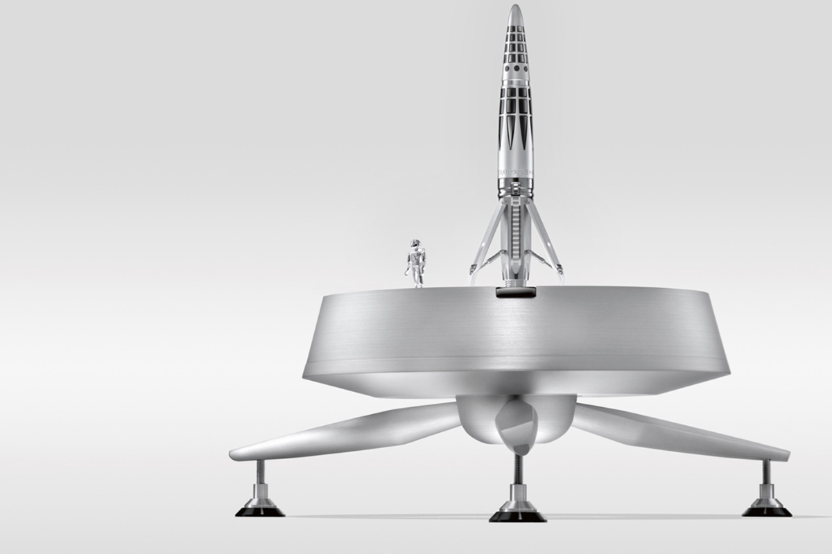 Along with the pen is a box (circular and made to look like a launchpad) and a resident astronaut. The small, androgynous figurine is made from rhodium-plated silver and is magnetized—so it can be placed on the writing instrument, as if it’s climbing on- or off-board.