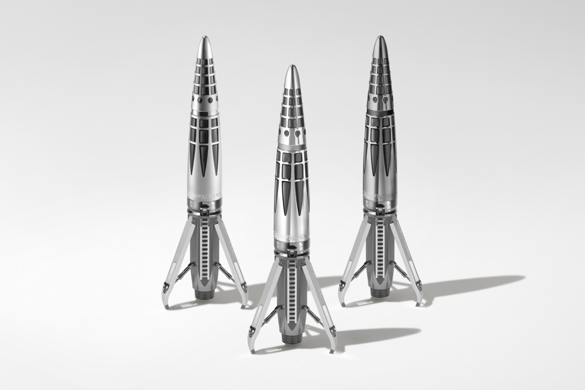 Made by creative lab and horological machine-makers MB&F and manufacturers of fine pens, Caran d’Ache (founded in 1915), the new limited edition Astrograph is a striking instrument that’s much more than just a pen. The two Geneva-based brands are known for crafting exquisite and awe-inspiring work, and this is no different. The Astrograph is a space-themed piece which sits proudly on any desk. The slim, curved pen, which clearly reflects the shape of a rocket, is available as a roller or fountain pen (featuring a rhodium-plated 18k gold nib). Built into the pen is its impressive and surprising base—three legs and a miniature ladder work as a stand for the pen (and an awesome object to inspire space travel daydreams).