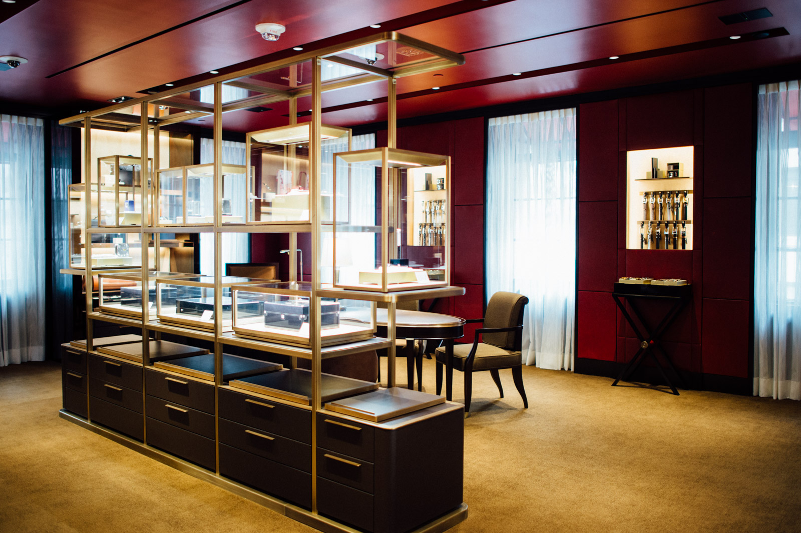 Rising a floor higher, one finds the Gary Cooper salon dedicated to luxury watchmaking. There’s a balanced organization and warmth to the room, again with ample space for privacy when considering a purchase. The wall art was gifted by Cooper’s daughter Maria and focuses on the actor’s relationship with his Tank watch. Of equal beauty, however, are the displays featuring Cartier watches.
