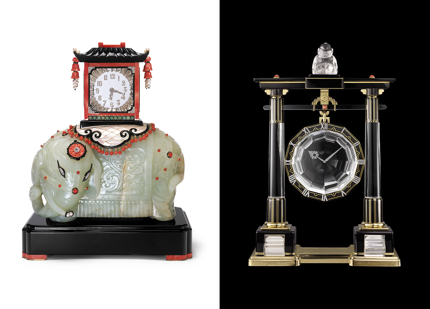 The exhibition turned an ideological corner, featuring six pieces produced by the brand between 1923 and 1925. This was a period of art deco influence on the clocks. Further, at this time Europeans were drawn to Asian culture. With these combined forces, the clocks took on new life—in some instances adopting the form of a shrine gate and others actually integrating Chinese sculptures. Louis Cartier was quite the collector and would buy antiques from numerous inspiring cultures. One piece in particular, featuring a jade elephant, defined this decade’s stylistic pathway. “You have to imagine the sculpture as just the jade,” Lepeu continues, “without any decoration. Cartier brought this piece to his workshop and asked his designers to design a clock or an objet around the sculpture. All the cabochon and the pagoda were made at the Cartier workshop.”