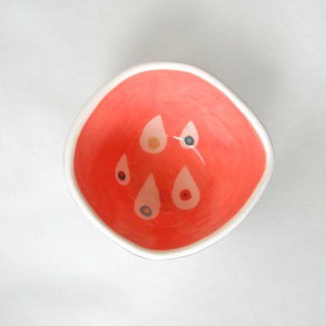 While simple off-white ceramic dinnerware is our go-to for setting the table—sometimes a pop of color in the dining room is just the ticket. San Antonio native Susan Rodriguez has been working as a ceramicist for over 20 years, after graduating from Texas State University in both design and ceramics. Each piece in her line Ceramica Botanica (which was featured on the Etsy blog) is made in her backyard clay studio—where the hot, sunny weather is perfect for drying the paint quickly—and is painted with bright colors and bold patterns. Rodriguez cuts shapes out of recycled magazines and mail and uses them as stencils for her patterns, which results in different layers in the glaze. “I started doing exaggerated ornate hand-built pieces trying to imitate spectacular botanical architecture. Botanical forms still excite me but now my pieces have evolved to clean, simple, subtle organic forms with detailed, colorful patterned surfaces,” Rodriguez tells CH. “I am attracted to patterns and color; to me, they tell a story of time periods and places that everyone can have personal references to.”
