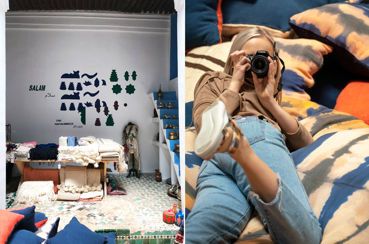 Artisan Project not only supports local craftspeople and their families, the brand also helps to keep important traditions and techniques alive. For the pop-up in Fès, Mohammad-Galbert opened her light-filled, airy private studio located in the medina to our guests for an amazing lunch of local favorites and an exclusive pop-up shop. Carefully selected textiles, jewelry, leather goods, vintage silver, hand-carved wood items, accessories and more were on display. Mohammad-Galbert’s blankets, cushions and rugs, each made in collaboration with imaginative local talent, covered the space—all tassels, tie-dye, and pom-poms that begged to be touched.