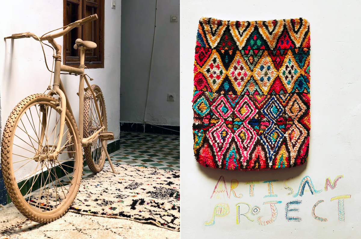 Also represented at the pop-up were wood artisans Mouhcine Khadira and Omar Sassa, whose work shares similarities while being quite stylistically distinct. Both Khadira and Sassa teach at local schools—Khadira teaches at the Artisanal School in Sefrou, where his atelier is also located, while Sassa teaches in both Sefrou and Fès—helping to keep their craft and tradition alive with younger generations. Perhaps a standout of the pop-up was Khadira’s fully functional, full size wooden bicycle—a piece so meticulously made it looks entirely ridable.