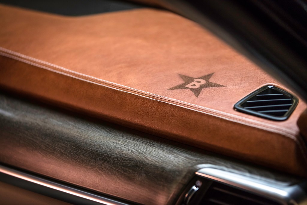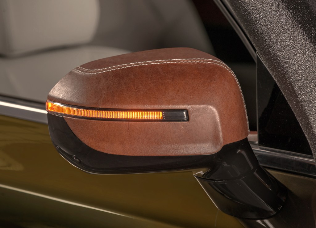 Maxwell perfectly understands that balance of ruggedness and sophistication—and it’s evident in his design touches on the car. The leather straps used as tie-downs for the hood and roof-rack, as well as the buckle hardware, echo materials you’d see on a Texas ranch. The “wood”-trimmed roof-rack, rough-hewn rope and leather-wrapped sideview mirrors might not make it to production, but they convey the vibe perfectly.