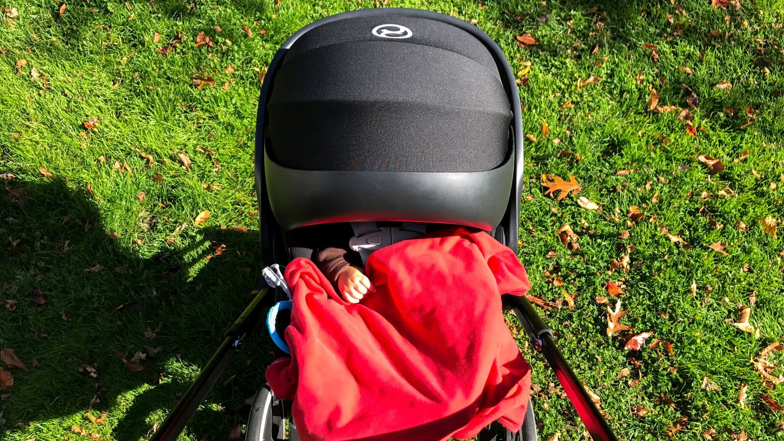Materials make the Cybex system ultra-functional too—a thick water-resistant canvas wraps the carry cot and stroller seats and shade, which is “XL” and shields babies well. Durable fabric on the lower part of the seat stands up to spills and kicking feet. While the addition of the rain cover protects tots from inclement weather, it’s designed for everyday showers and isn’t secure or waterproof enough for major wind and rain, like the thunderstorm we braved one day.