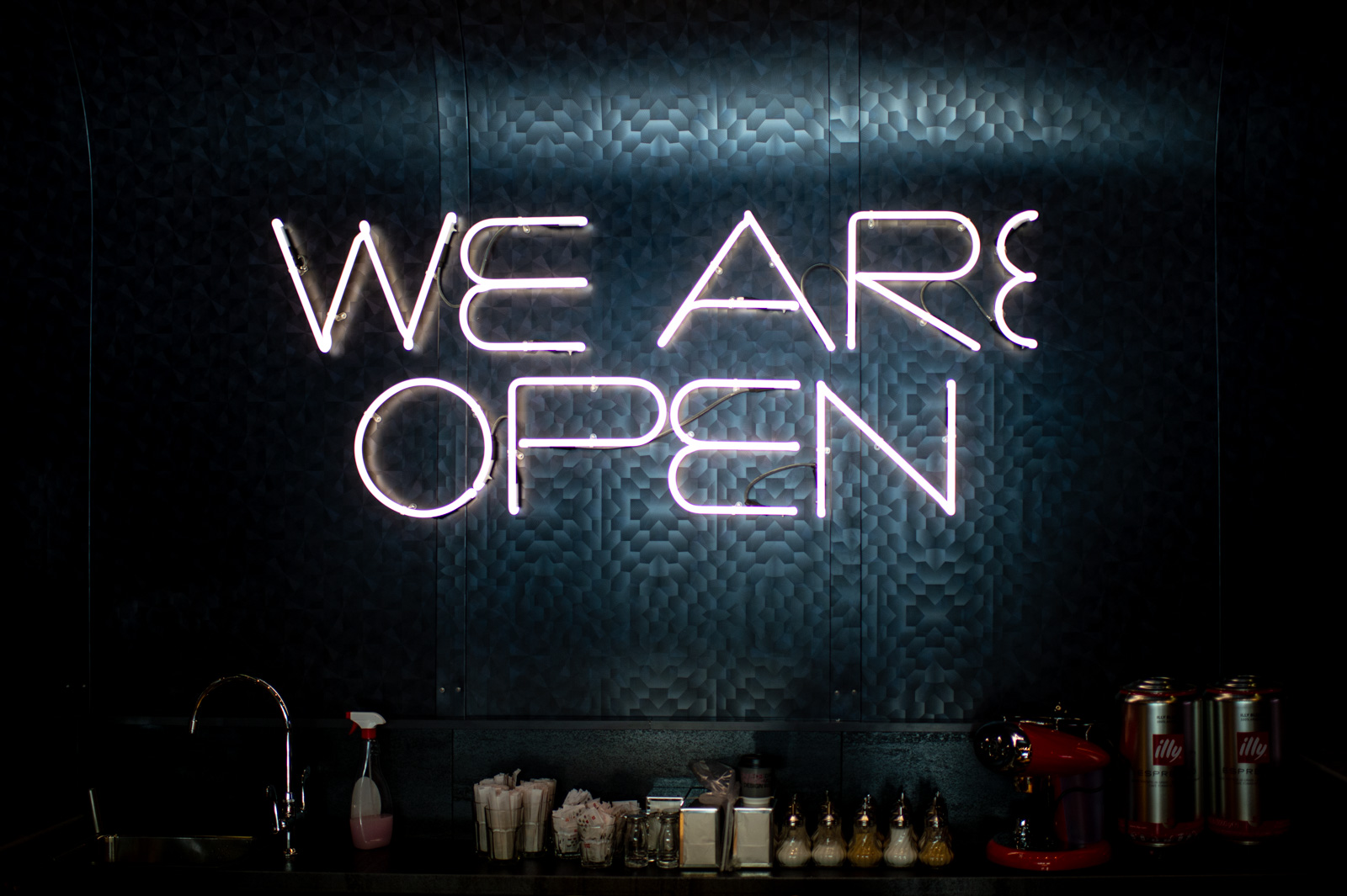 Sitting with David Rockwell in a pink booth that reflects the optimism of the mid-west he remarks, “The first thing that was critical to explore was the counter—it is the most democratic of the spaces in a diner.” And while the entire space is an extraordinary story of colors, materials and finishes, the 14-meter-long central counter is the appropriate focal point. The impressive stone span is crowned with a diner vocabulary rendered in neon using the custom font 2X4 created for this project.
