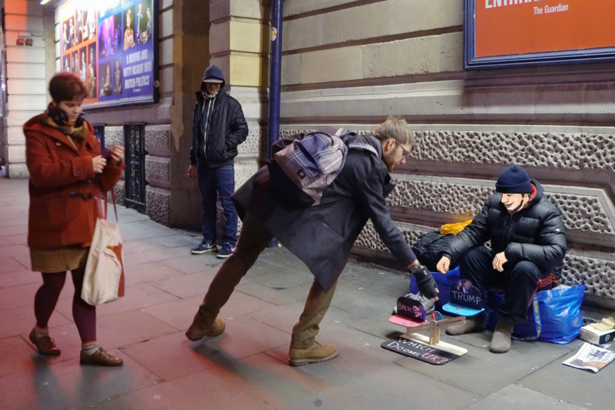 A self-dubbed “playful interventionist,” TU Delft grad student Tomo Kihara uses research and design activism to reframe societal issues. His recent project, called Street Debaters, helps homeless people keep their dignity by earning money through public discourse instead of having to beg for spare change. Kihara tried out several ideas, from creating street games to taking Polaroids of people holding flowers, but a breakthrough came via the US election when people could vote for a candidate by placing a coin in front of their favorite nominee (which included Yoda). He decided to try it with other topics of debate, and created a wooden scale which he placed before a chalkboard stating two opposing opinions; passerby could drop a coin on the side of the scale that corresponded to their belief. As one can imagine, people enjoy expressing themselves and not only did the money pile up (the average income was £13.50 per hour) but it also inspired regular conversation between the homeless person and the person who stopped, which in turn helped form a better understanding and emotional connection among everyone.