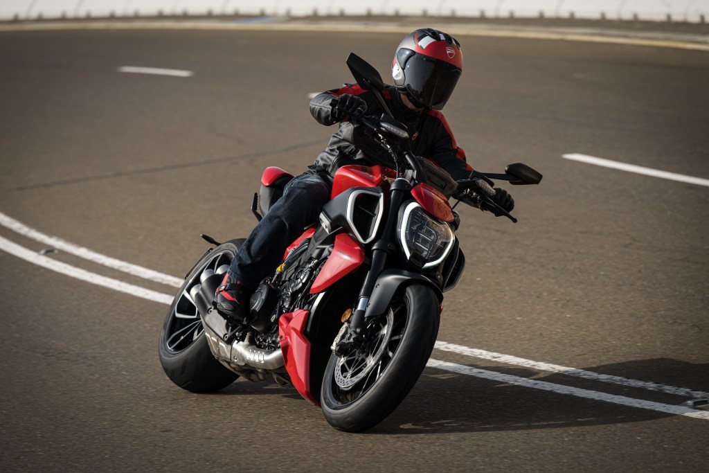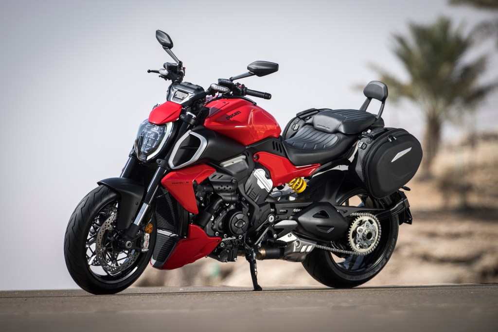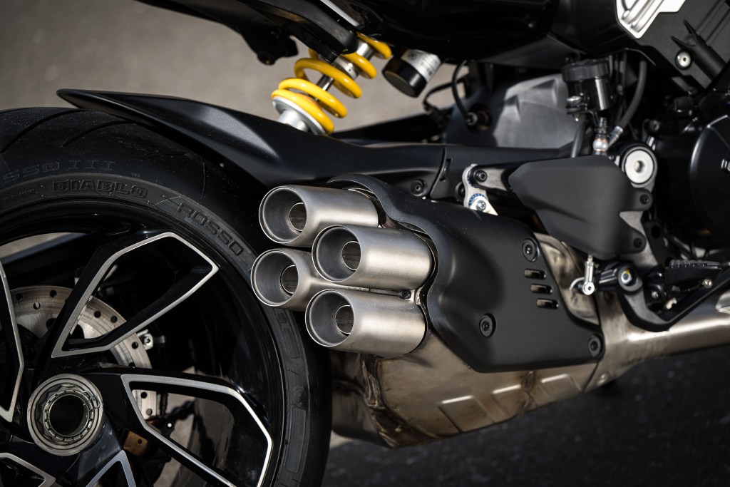 Stare long enough at Ducati‘s new Diavel V4 and it starts looking like something other than a motorcycle. Its exhaust twists into a metallic organ. From the side, a distinct visible bend cuts from the tail to the nose—a sort of curved stress line, with its highest point at the apex of the gas tank. From the rear, the taillight twinkles into a firmament of red stars.