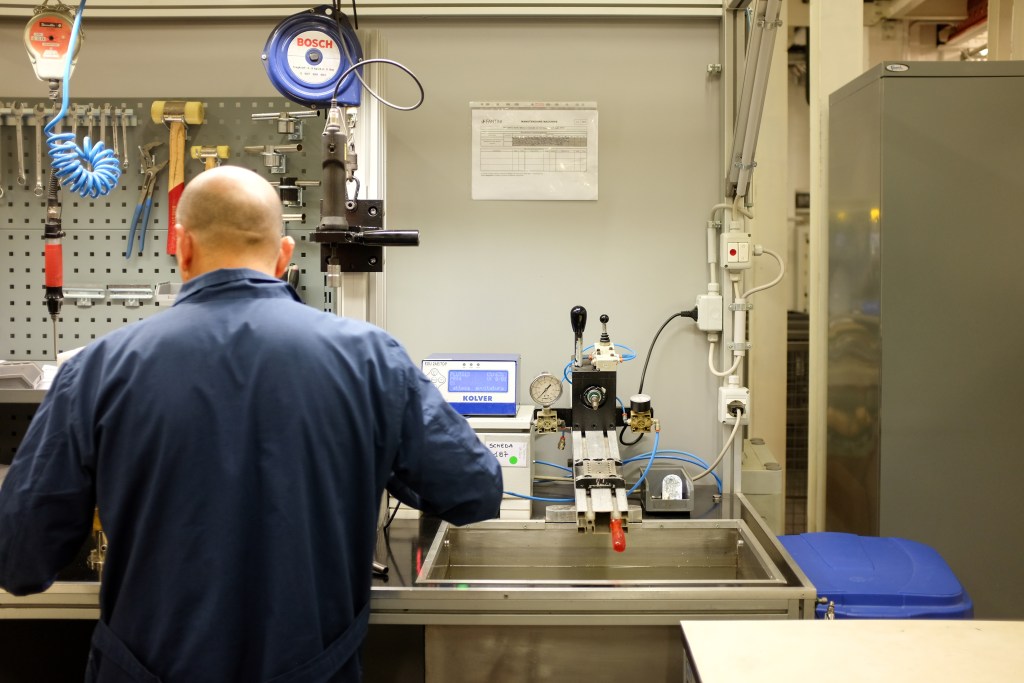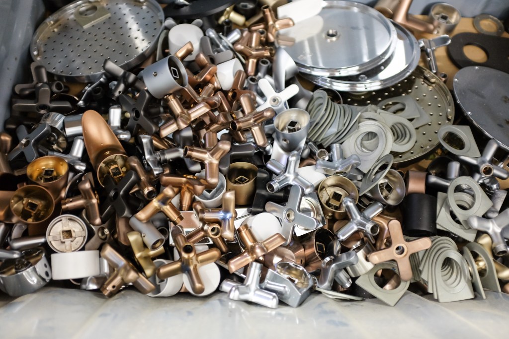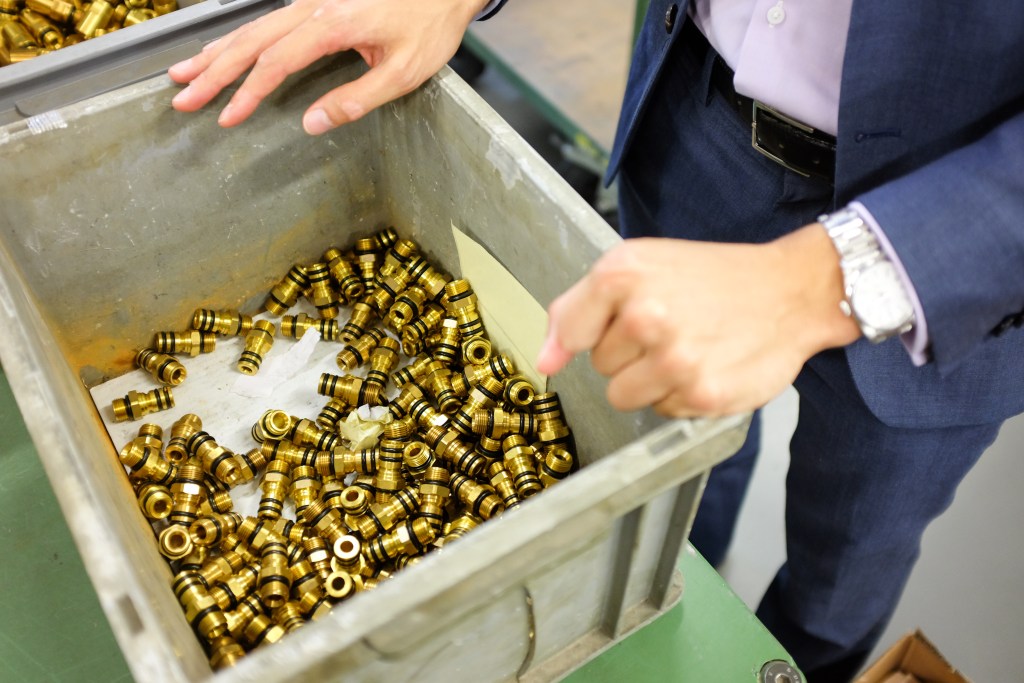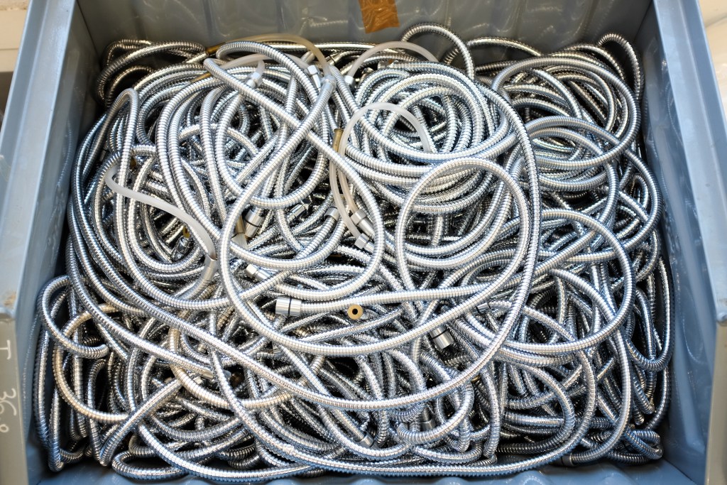 The Fantini factory is incredibly silent and feels like a laboratory rather than a production site. Several elements come from neighboring companies, but are assembled here in Pella. Every single piece is tested: before, during and after assembly. On a technical note, only cartridges and aerators are standard, while every other element is custom-designed and made. Since Fantini’s market is global and reaches 65 countries, faucets and showers are made from different alloys that can meet local requests and regulations. Hoses vary quite often, and as a result there is no real standard production, but several small orders that can change according to the final destination.