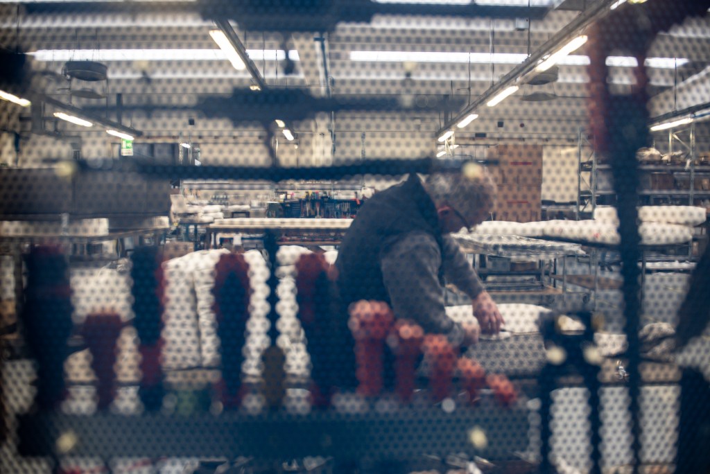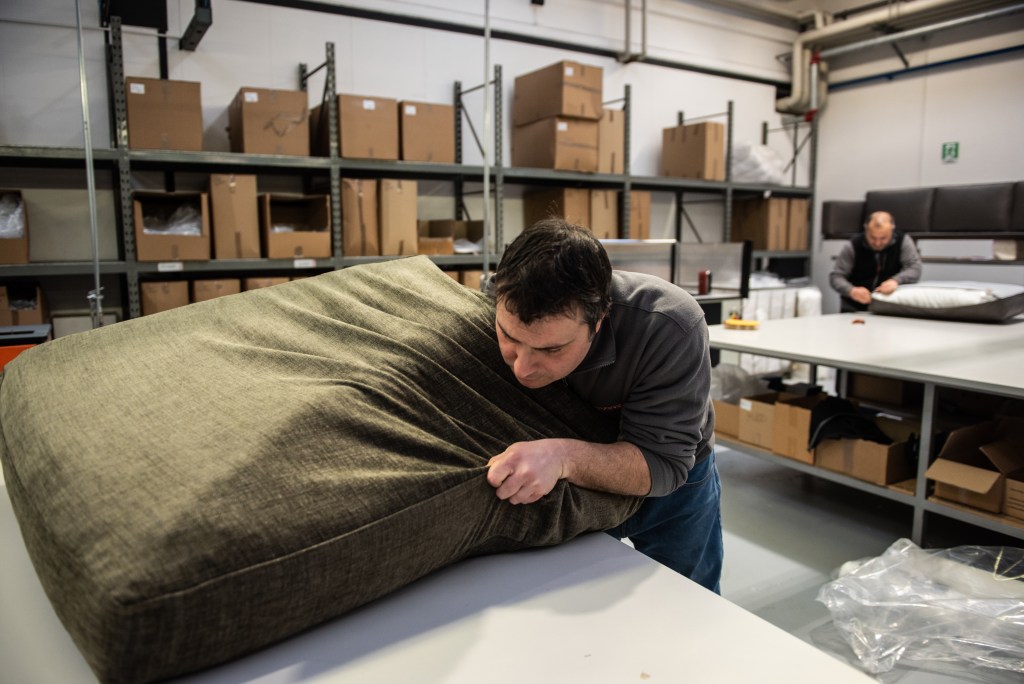 When covers are ready it’s time for sofas to be dressed. In order to place the upholstery perfectly employees dive into the fabric until they almost disappear inside. The finished product is then taken to a machine that creates a delivery box in real-time that’s perfect for its measurements, ensuring the piece will arrive in the best condition possible.