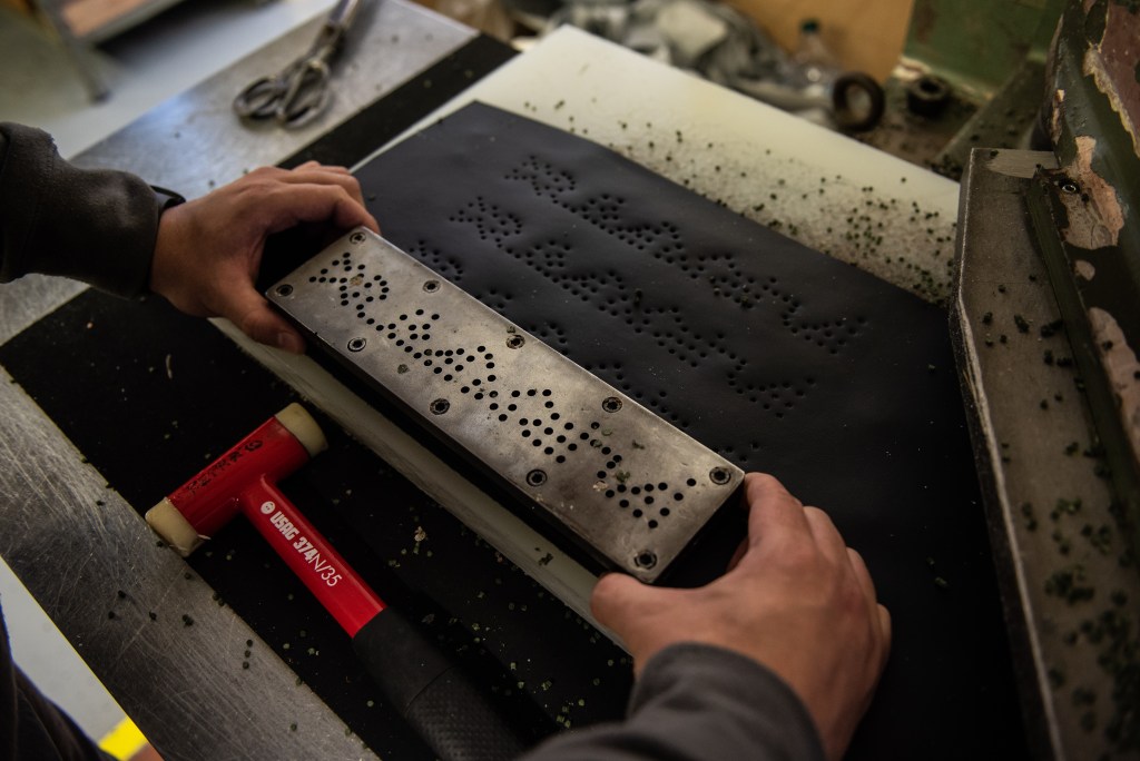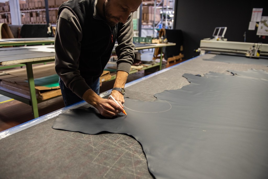 Each hide is laid on a wide workbench where it is carefully observed in order to identify imperfections. Any flaws are highlighted with a yellow pencil. Then the lights in the room are switched off and existing patterns are projected onto the hide. Craftspeople move the projections around the hide to avoid defects and reduce off-cuts to minimize waste. When the operator is happy with their mapped-out hide it’s laser cut it. These precise pieces of material will then be used to cover furniture.