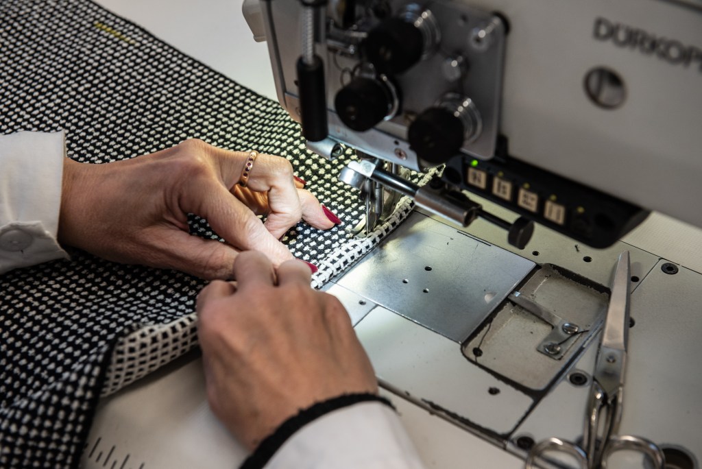 All of these fabrics are then diligently sewn together. Every employee completes each step with the same care and precision we’ve seen in high-end fashion houses. The recently renovated sewing space is isolated from the rest of the production area, where it’s quieter and cozier. They pay particular attention to sewing eyelets—a resistant, flexible element that must remain in place that can be hooked on and off with ease.