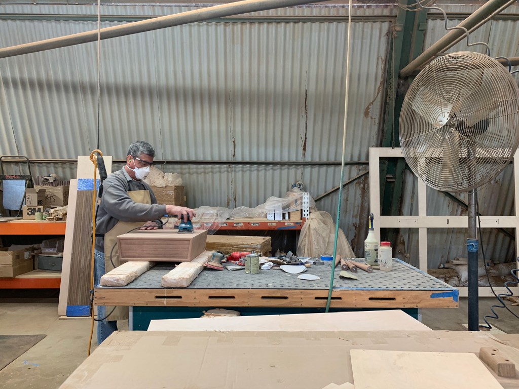 All of the wood molding is also done in-house. “Curves are always more expensive,” she continues. In a large woodworking structure near the fiberglass room, wood layers are pressed into proprietary forms. These yield things like the spider leg base for the shell chair. Modernica prides themselves on the fact that very little waste is produced. And, of course, that humans are absolutely fundamental.