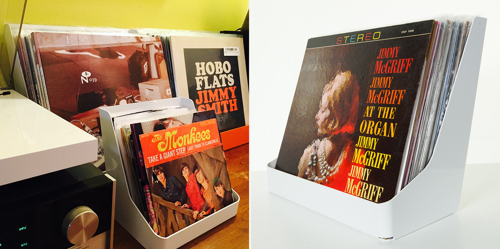 There is a myriad of record storage and organizing designs out there but the recently launched flipbin—currently funding on Kickstarter—grabbed our attention. Manufactured in Chicago, the aluminum storage unit is angled (supported by another bent aluminum kickstand) for easy browsing and protective storage, and further doubles as a great display. It’s meant to complement your shelves and shelves of vinyl by serving as the place for bringing favorites to the front. Unlike the four-LP max capacity Welsey & Kemp Record Easel, however, the Model 33 flipbin can hold up to 33 12-inch records and the Model 45 similarly can hold 45 7-inch records.