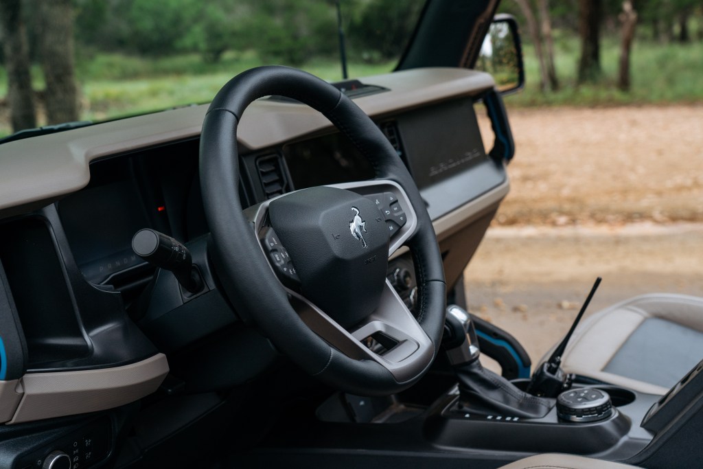 Even with all its lovely squared-off corners and just the right amount of retro-design mixed into the formula, the best view of the Bronco is from the driver’s seat, preferably with the driver’s roof panel off. The view over the flat hood, between the black metal “trail sights” positioned at either corner, is one to enjoy for hours on end—whether driving on pavement, dirt, water, sand, mud or rock. It’s a comfortable seat, no matter the terrain you’ve found yourself on.