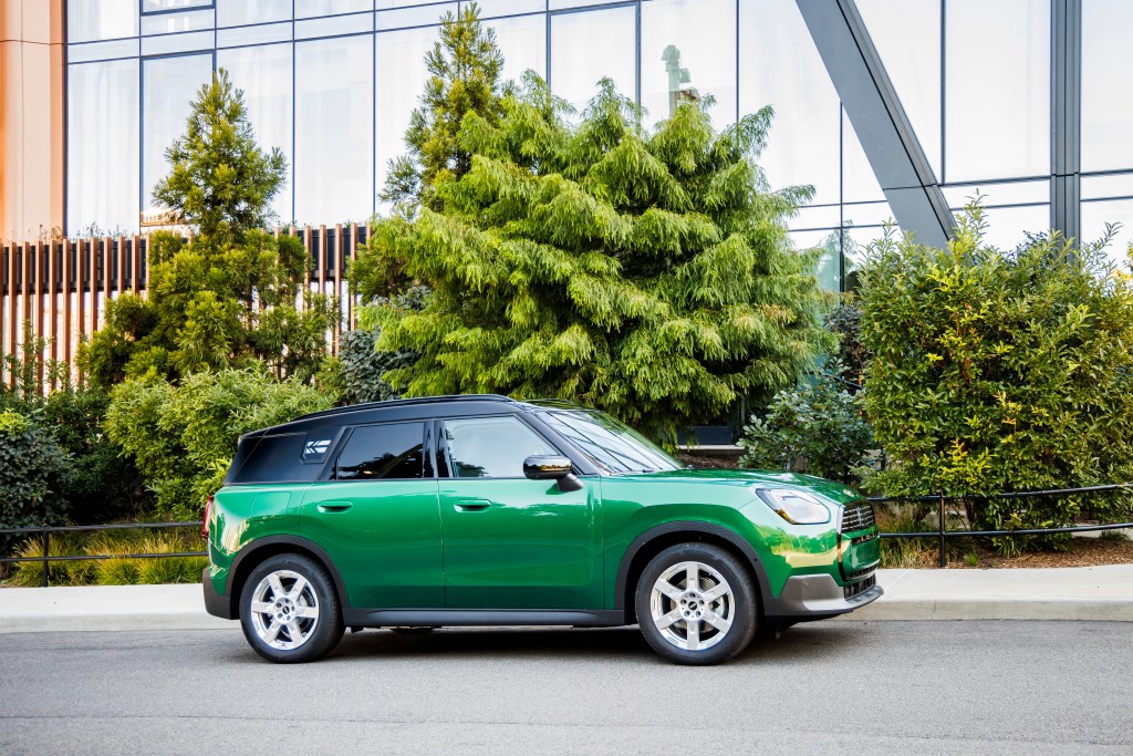 MINI-style is what people want—and that’s a hit of cheekiness stirred into the mix. You see that in the Countryman E’s Union Jack taillamps, but also in the redesigned trapezoidal headlamps. True traditionalists will squawk, and that’s why MINI will retain circular beacons on the new electric Cooper, but the Countryman E is walking a finer line, which is why it’s more interesting. Its bulky shoulders and floating roof both pass the DNA helix directly from the Cooper, but there’s more weight to the roof, announcing that can-do-ness that those kayak-and-bike-hauling rival brands showcase.