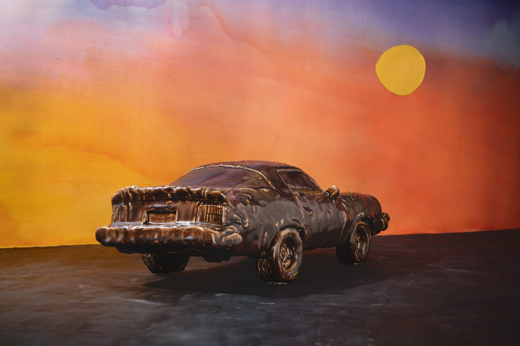 “Since the ’50s, the car has become a symbol of American freedom, and it’s obvious why,” she continues. “Films, music and visual arts have played upon this car mythology because it’s very interesting. Cars hold a powerful allure for people because they’re symbolic of American freedom, and sadly, at this point in time, they have also come to represent something else, the threat of climate change.” Simpson’s works embrace all of this and more.