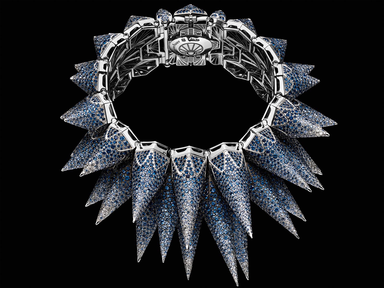 Haute Joaillerie collection, the Diamond Outrage is just as much a sculpture as it is a cuff watch. There are two iterations: one with 9,923 brilliant-cut diamonds and 354 baguette-cut diamonds; one with 11,043 brilliant-cut sapphires. Both feature a series of gem-set 18k white gold stalactites at various sizes. Completely breathtaking and unlike anything else out there, this is a Quartz movement timepiece for dreamers. Pricing is available upon request.