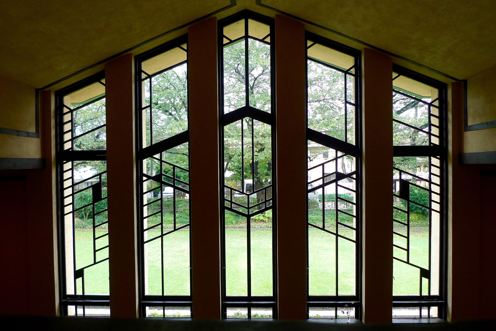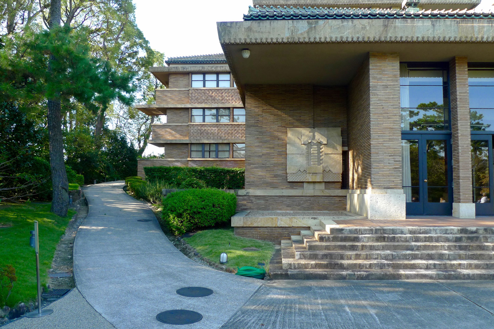 The largest preservation from Wright’s Imperial Hotel are housed at the aforementioned Museum Meiji-Mura near Lake Iruka, outside of Nagoya. There, the lobby has been moved and rebuilt amongst the many example of Meiji era architecture to honor the legacy of the hotel and Frank Lloyd Wright’s innovative and provocative design ideas. Complete with the pool of water out front that helped save the structure during the earthquake, visitors can see first hand the symmetrical facade and walk up the steps and through the front doors to experience the feeling of being in the original lobby. A tearoom filled with Wright’s furniture designs serves up warn drinks and sweets. Cases display the original Wright china and servingware.
