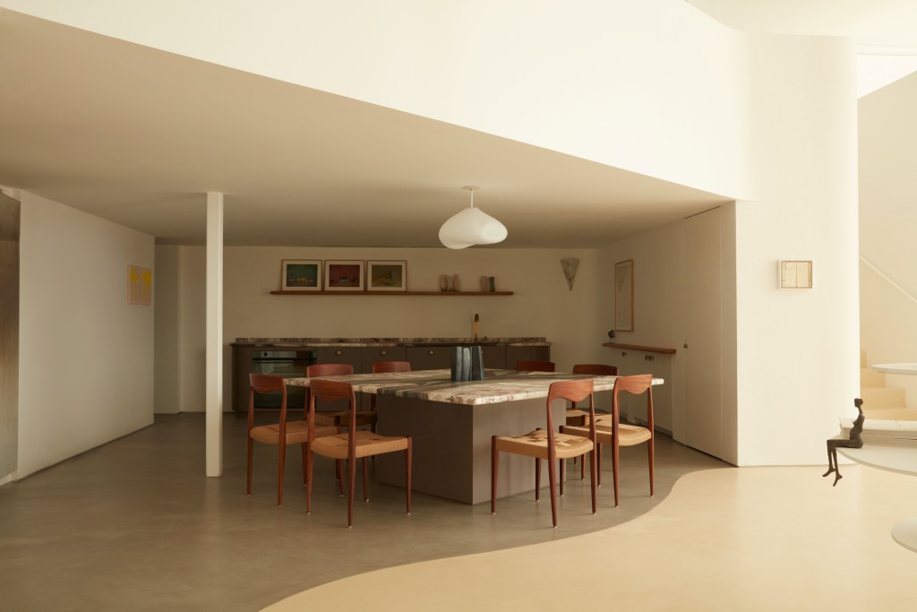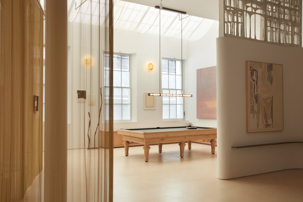 Of equal importance is the unexpected way that du Chalard developed the spacious SoHo gallery with French American architectural duo Tess Walraven and Nike Vogrinec, as well as Keith Burns. “It all comes back to the concept of the gallery, which is to change how we see artwork by presenting it in ways that are closer to collectors’ homes,” she continues. There’s an enveloping, domestic nature to the gallery, which is loosely divided into areas that emulate those found in a home. Only, each area is accented by artistic works in situ—from arching sculptural additions inside of wall from Gerd Kanz to slender, totemic towers of ceramic by artist Lili Delaroque that allude to historic cast-iron Corinthian columns nearby. The space itself is a work of art.