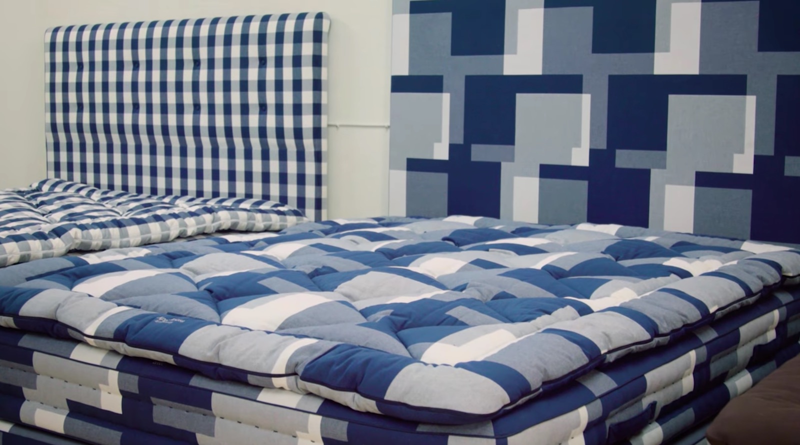 The Appaloosa is a modern expression of the classic blue check pattern, inspired by Cubism, Modernism and kaleidoscopes. Larger, bolder, more colorful and spritely, it brings a fresh energy to the brand while paying the most sincere respects to its heritage. Working with this new design presented fresh challenges for the company, both in terms of making the pattern repeatable, but also in structuring the pattern for the construction of the beds. Many additional hours go into making an Appaloosa edition mattress.