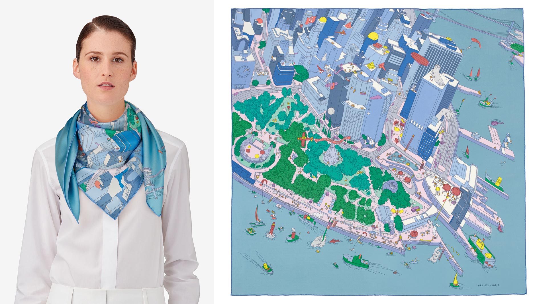 A decade ago Hermès opened the doors to a retail location on Broad Street in lower Manhattan initiating a commercial return to a neighborhood in recovery. Only steps away, the Battery—a 25-acre park that now sees seven million visitors a year—was also under development, spearheaded by the Battery Conservancy. Both of these organizations emphasized—and continue to emphasize—the importance of building and supporting community, especially through challenging times. From their positions at Manhattan’s southern-most tip, they observed each other’s progress and the neighborhood’s tourist and residential acceleration. This year, Hermès has been chosen as the honoree at the Battery Conservancy’s annual gala. In turn, the French luxury retailer announced the limited edition Battery New York scarf. Designed by Hermès artist Ugo Gattoni, the 100% silk twill, hand-rolled scarf depicts a vibrant aerial scene of the Battery and lower Manhattan with unexpected artistic flourishes. And, of course, a portion of the proceeds will be donated to The Battery Conservancy.