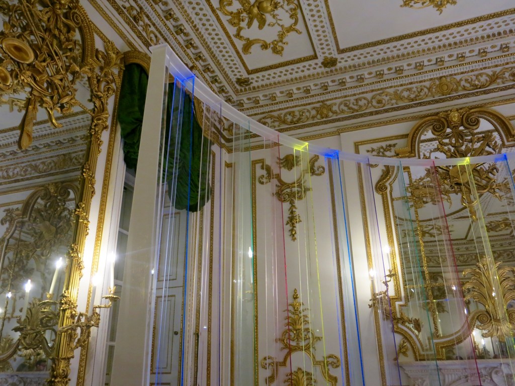 A quote by Estonian composer Arvo Pärt inspired the “Memory & Light” installation: “I could compare my music to white light, which contains all colors. Only a prism can divide the colors and make them appear; this prism could be the spirit of the listener.” Together with Arup, Pärt has created a tailor-made installation for the V&A’s Norfolk House Music room, a beautiful 18th-century room decorated with gilded stucco that’s usually one of the most popular rooms to host installations during LDF. A screen made of rainbow-colored Perspex (plexiglass) represents the prism, as music fills the room and visitors can listen to Pärt’s words in headphones while lounging on a leather listening bench. It’s a welcome break from LDF madness.