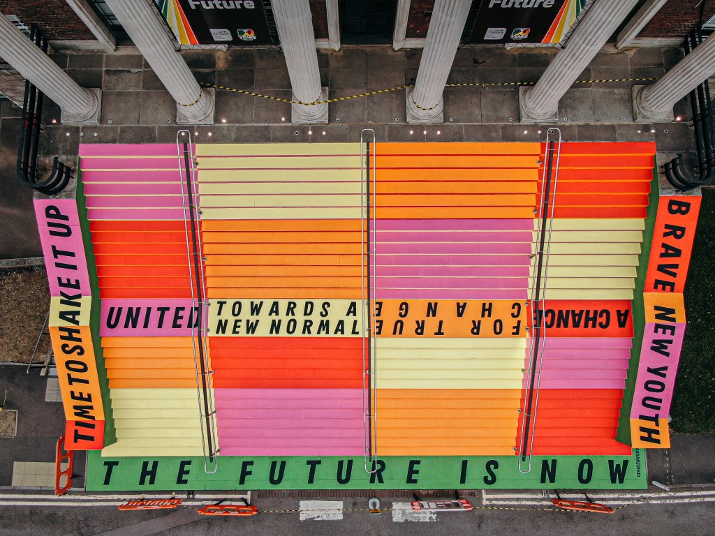 On the steps of Walthamstow Forest College, a bright and bold large-scale painted work announces “The Future Is Now.” The artist, Fandangoe Kid, partnered with several local school children to bring the colorful work to life. Though referred to locally as the “Staircase of Dreams,” the piece is actually called “Towards a New Normal,” and is part of the William Morris Design Line, a community-focused arts walk through the Walthamstow neighborhood (and an official part of the London Design Festival).