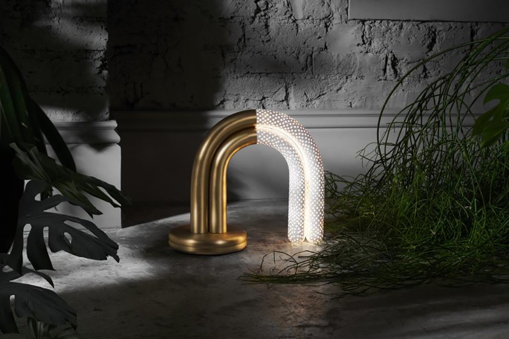 Following last year’s glorious Lunar House at LDF, Bohinc Studio—helmed by Lara Bohinc—launches the bold, elegant contemporary lighting collection called ion. Inspired by Jupiter’s rings, Bohinc has been creating beautifully curved pieces. Perhaps the standout of the collection, the ion desk light consists of two tube-like arches, bending together to create a semi-circle. The brushed brass on one side contrasts pleasingly with the white, perforated half. Even switched off, the piece creates a statement, but when lit, it becomes quite other-worldly.
