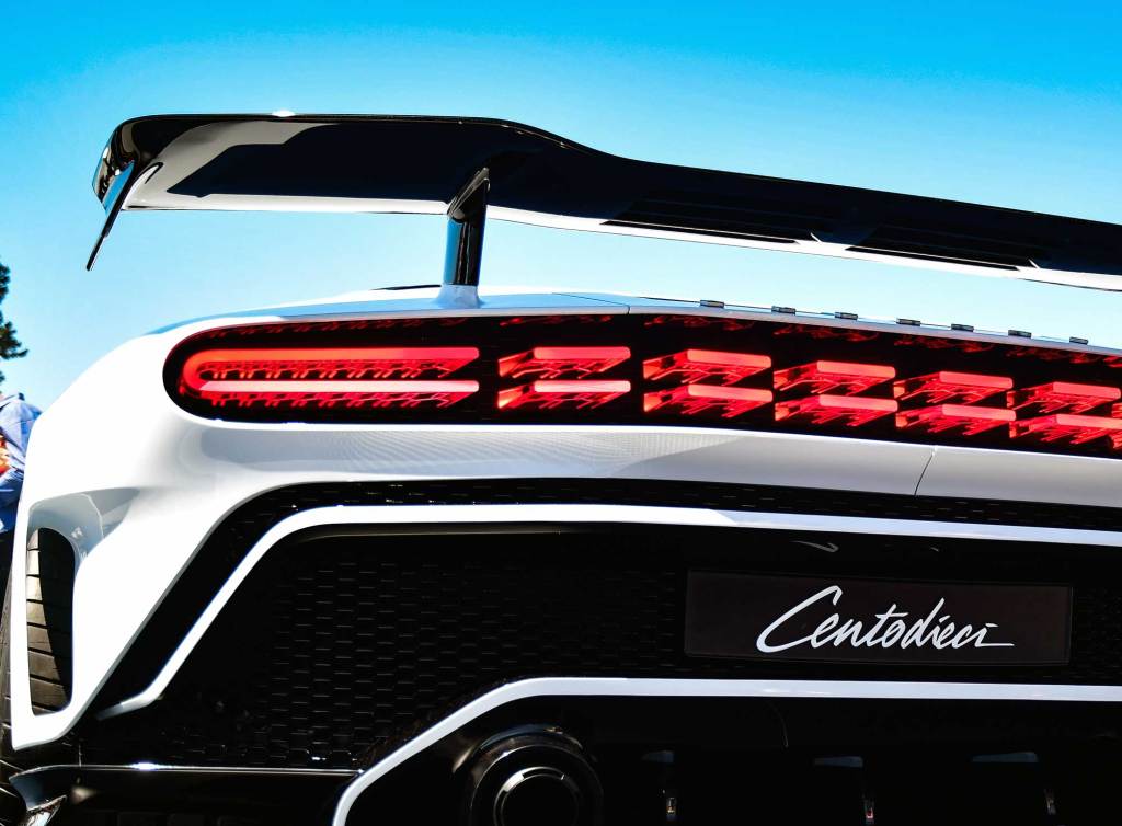 If some of Benedini’s ideas were whimsical, Heyl’s modern touches make them functional. He explains that by reinterpreting the wedge shape of the ’90s car, they were able to make far more downforce at the front of the Centodieci than in the Chiron—a key to making a wedge stick to the ground. While the finned nose of the new car looks purely aesthetic, the design actually draws in air that then cuts beneath the hood and mashes the front tires earthward. Air that sweeps across the roof of the car is captured by NACA ducts in the carbon fiber body, down and through a slit in the backlight glass and exits through the massive structure of the dozens of LEDs housed in an ovoid porthole below the giant spoiler.