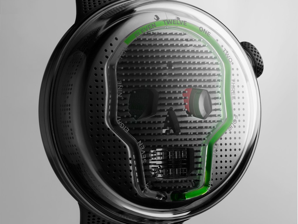 Launching in two styles—one stainless steel with green fluid and another stainless steel with black DLC coating and blue fluid (more than a difference in color, but an actual technical change)—the series features a titanium dial embellished with 313 18-karat gold pins, and nearly 1,000 meticulously drilled holes. The former fall within a skull motif, a frequent design reference from the brand. Here, however, one eye has been replaced with the words “soon” and “now.” The mission for the text: strike home the notion that time is fleeting and precious.