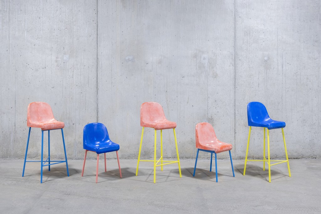 For his Fan Chair, designer Tobia Zambotti took discarded seats from the refurbishment of the KR Reykjavik football stadium and gave them new life as bar stools and chairs. Colorful, playful and bold, this collection is extra charming by way of the scars of countless emotional matches.